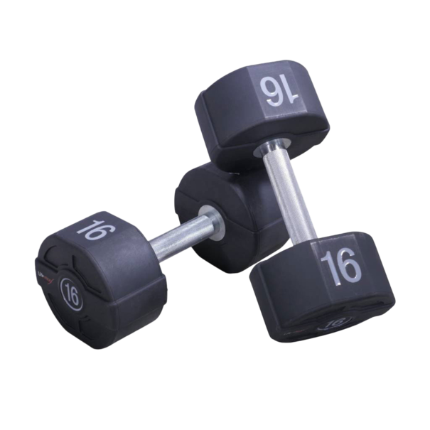 Kompakt kialakításuknak és az ergonómikus, finom recézéssel ellátott (30–32 mm átmérőjű) markolatuknak köszönhetően ezek a súlyzók kiváló kényelmet és kontrollt biztosítanak az edzés során. A fogantyú hossza 140 mm, ami masszív és stabil érzetet ad. A súlyérték minden súlyzó tetején, alján és elején egyértelműen fel van tüntetve a gyors és könnyű választás érdekében.
