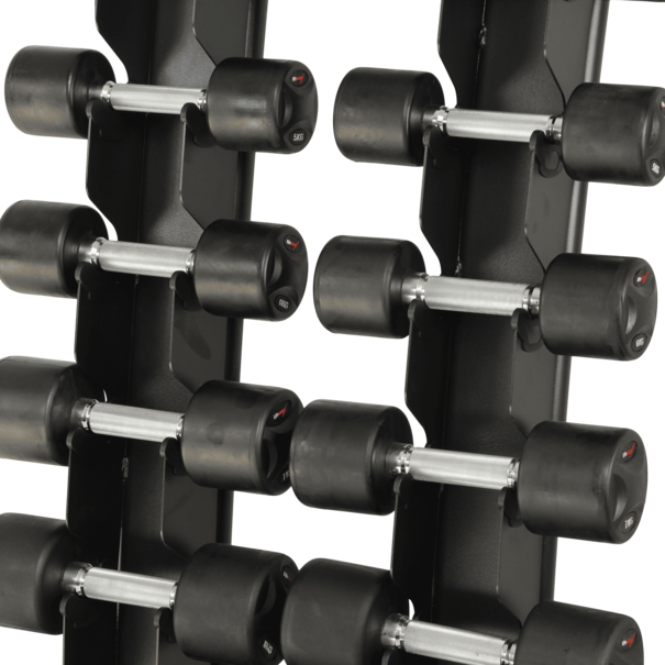 A masszív fém állvány gumírozott védőbakokkal (tartókkal) van ellátva a súlyzók védelme érdekében. Az állvány a következő típusú súlyzók tárolására alkalmas: