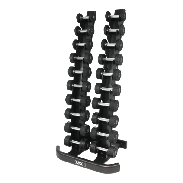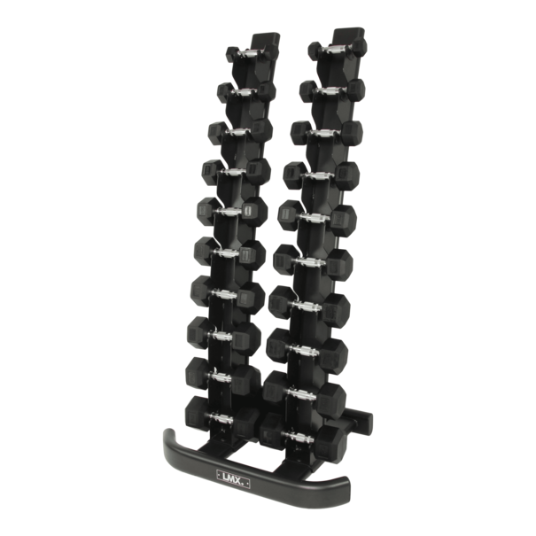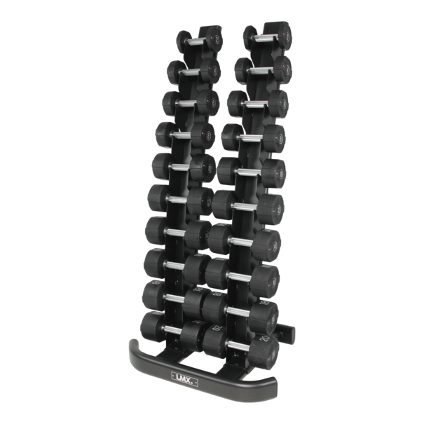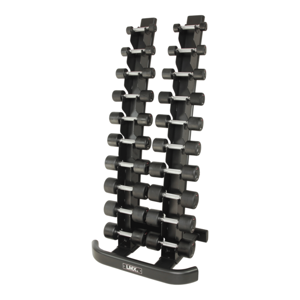 Az LMX1011 LMX.® függőleges kézisúlyzó állvány fekete porszórt bevonattal rendelkezik, és 10 pár (szett) kézisúlyzó számára kínál helyet.