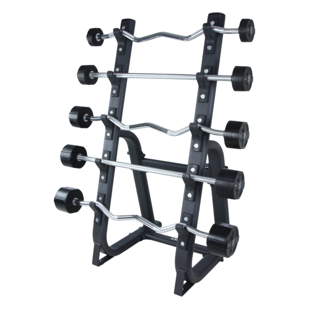 Az állvány legfeljebb öt súlyzórúd tárolására alkalmas, és gumírozott bölcsőkkel van felszerelve, így a rudak nem sérülnek meg a tárolás során.