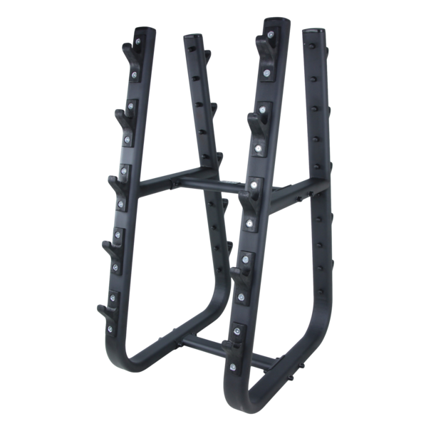 Az állvány legfeljebb tíz súlyzórúd tárolására alkalmas, és gumírozott bölcsőkkel van felszerelve, így a rudak nem sérülnek meg a tárolás során.